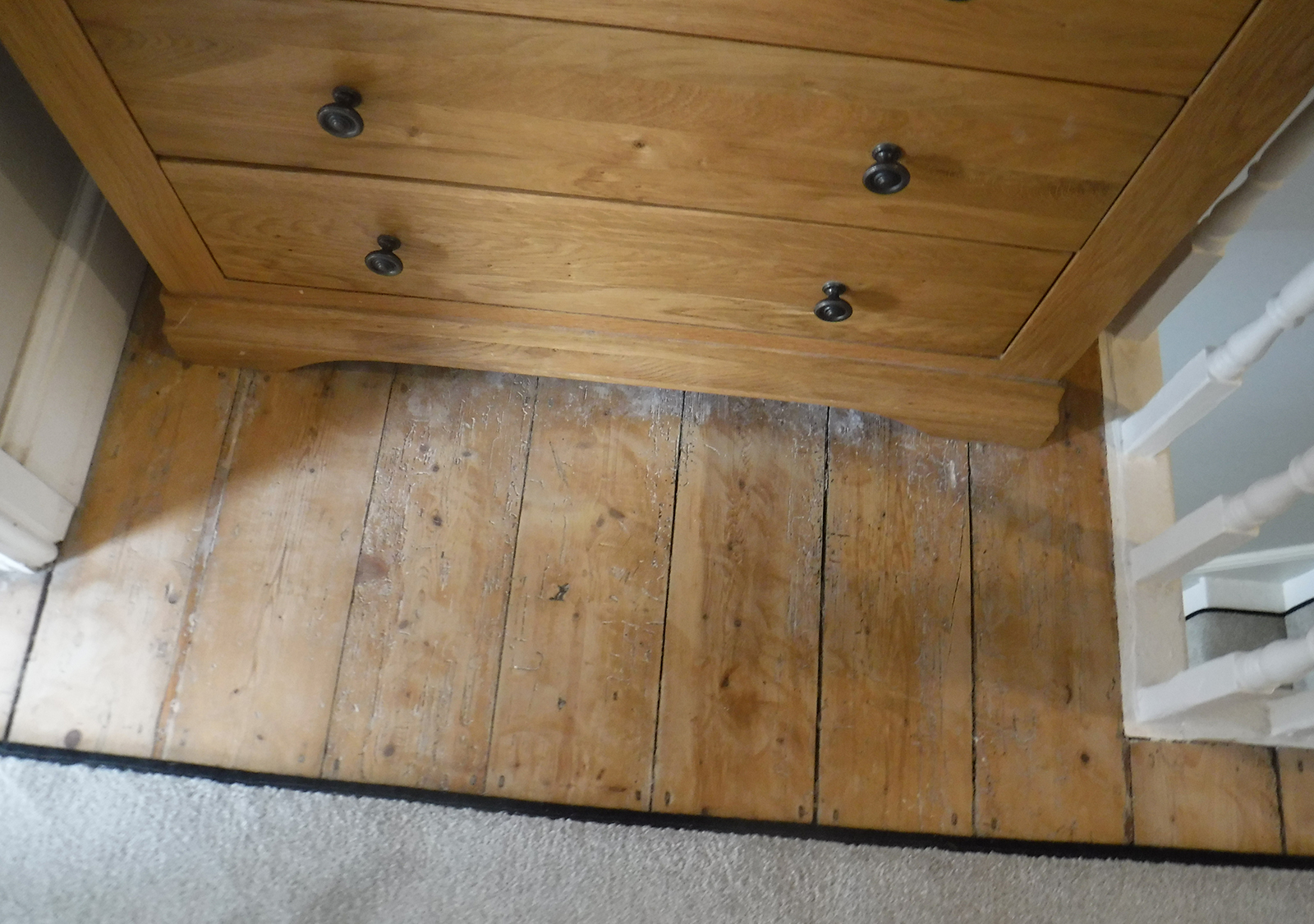 Signs of historic woodworm activity were noted to sections of the floor , visible through old