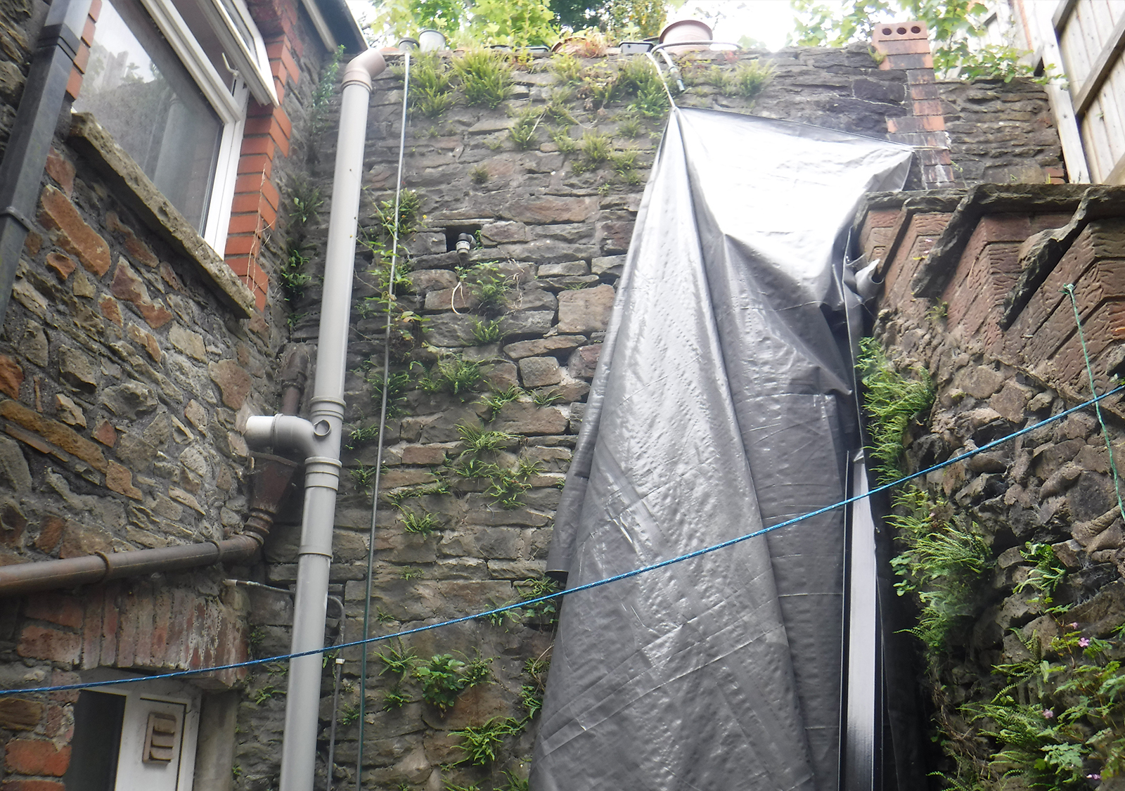 between the retained ground and the house wall. While no active moisture ingress was noted